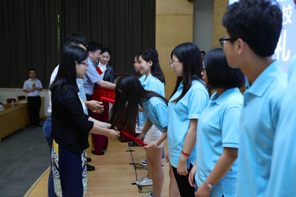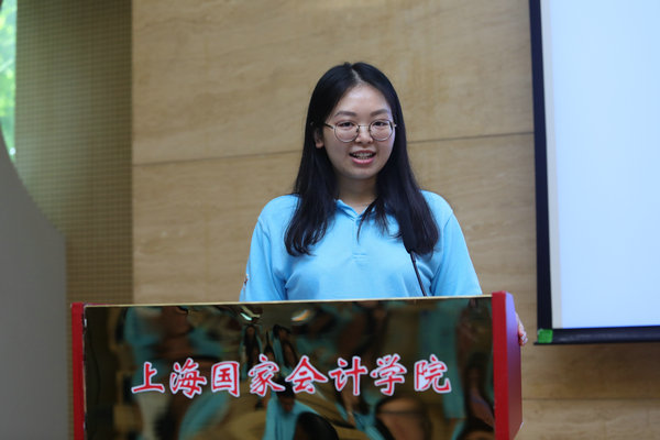 视频结束,台下在意犹未尽的笑容里渐渐沉默下来。灯光亮起,本次暑期学校的研究生代表邹雅嘉登台进行发言。邹雅嘉代表全体暑期学校研究生表达了对学位委员会、学院、老师们及工作人员甚至校园里一草一木的感恩与喜爱之情,并分享了在学院虽短犹长的精彩生活,引用马克李维在《与你相逢》中的话“金钱和权力并不能让我们永生。一个人只有通过跟其他人的感情交流与传递,找到自己在这个世上存在的价值,以及生命永恒的意义”,诠释了两周来的成长与收获,并愿同窗们此去前程似锦,再逢依旧如故。
