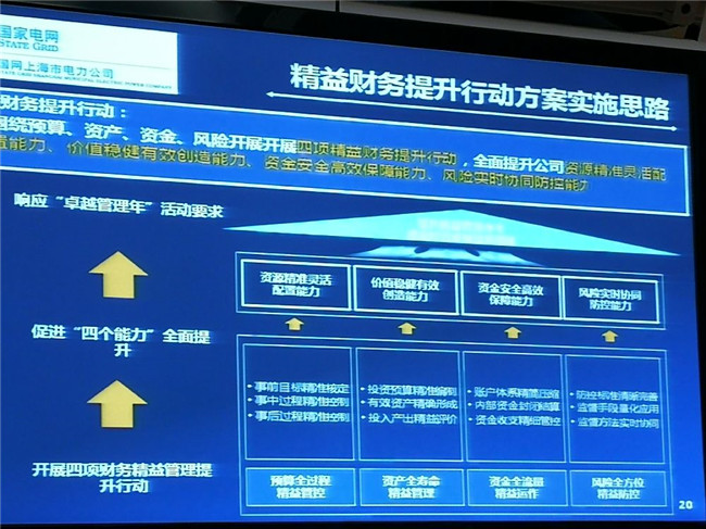 葛主任介绍说,通过上述两个行动计划,国网上海电力取得了六个方面的突出成就:一是建立宏观经济先行指标数据库,支撑经营目标精准核算;二是建立成本费用储备库,实现成本预算精准编制;三是构建项目预算绩效评价机制,指导预算投入的结构、规模和时序安排;四是实现工程自动竣工决算,提高效率和质量,促进有效资产精确形成;五是通过精简账户、内部封闭结算、精细管控收支,推动资金全流量精细运作;六是通过风险源头治理、常态管控、超前预警,实现风险精益防控,从而促进公司预算管理、成本控制、服务提供、财资管理、业财管理、企业发展六方面转型升级,最终促进公司实现财务精益卓越管理和智慧高效运营,推动经营发展提质增效。