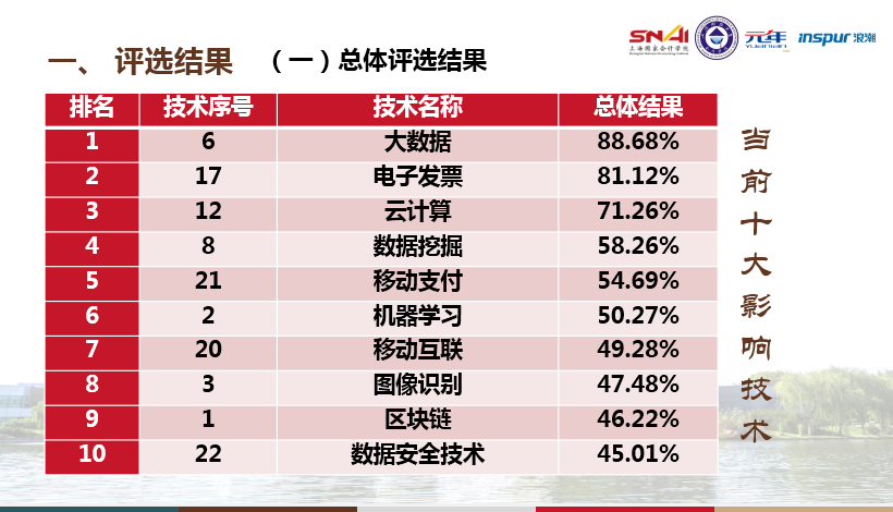 The result of the contest for top 10 information technologies that affect accounting practitioners was revealed at the 16th national accounting informationization conference on July 6. The contest was sponsored by the SNAI. Mr.Liu qin, the vice president of SNAI announced the results which are big data, e-invoice, cloud computing, data mining, mobile payment, machine learning, mobile internet, image recognition, block chain as well as data security.