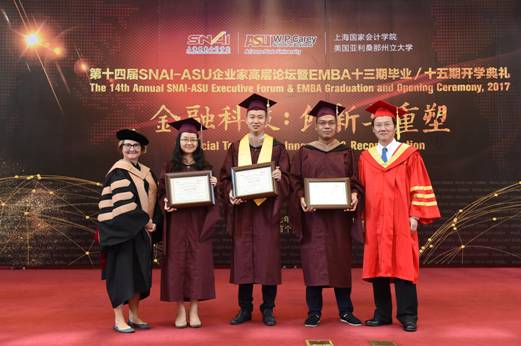 The graduation ceremony of EMBA 13th cohort and opening ceremony of EMBA 15th cohort were held at SNAI on July 8. Professor Li Kouqing, the president of SNAI, Professor Stefanie Lindquist, the deputy provost of Arizona State University, Professor Amy Hillman, the dean of W.P Carey School of Business attended the opening ceremony and gave remarks. The 14th SNAI-ASU executive forum on the innovation and reconstructing of financial technology was also held on that day. The EMBA program is cosponsored by SNAI and W.P Carey School of Business.