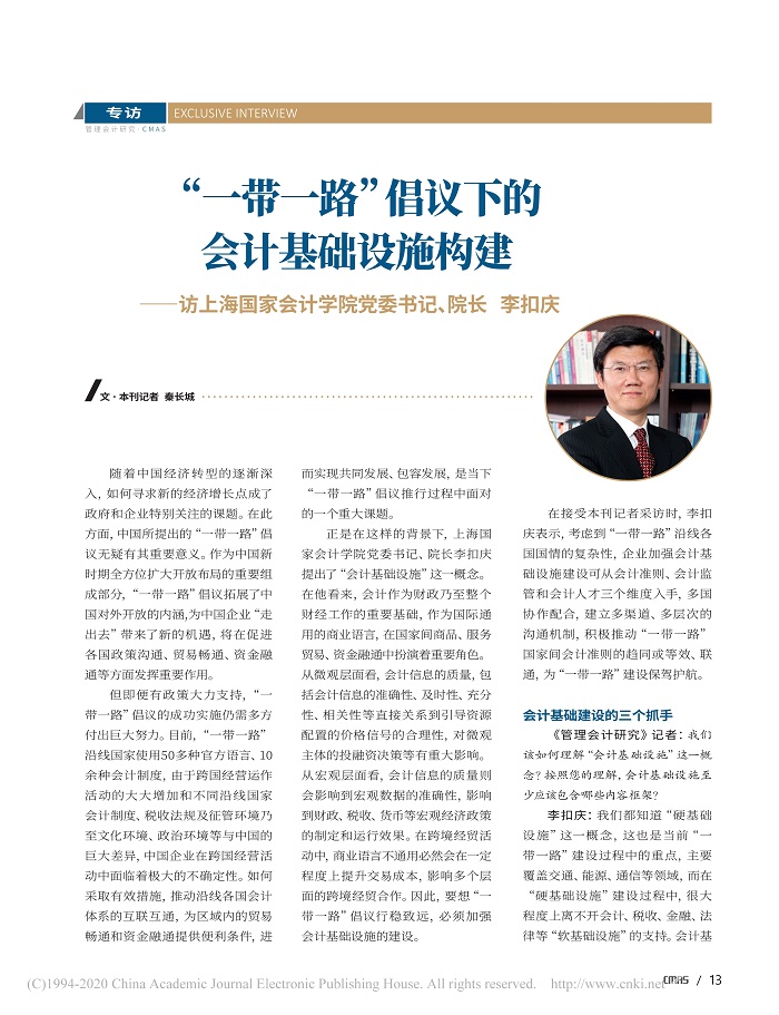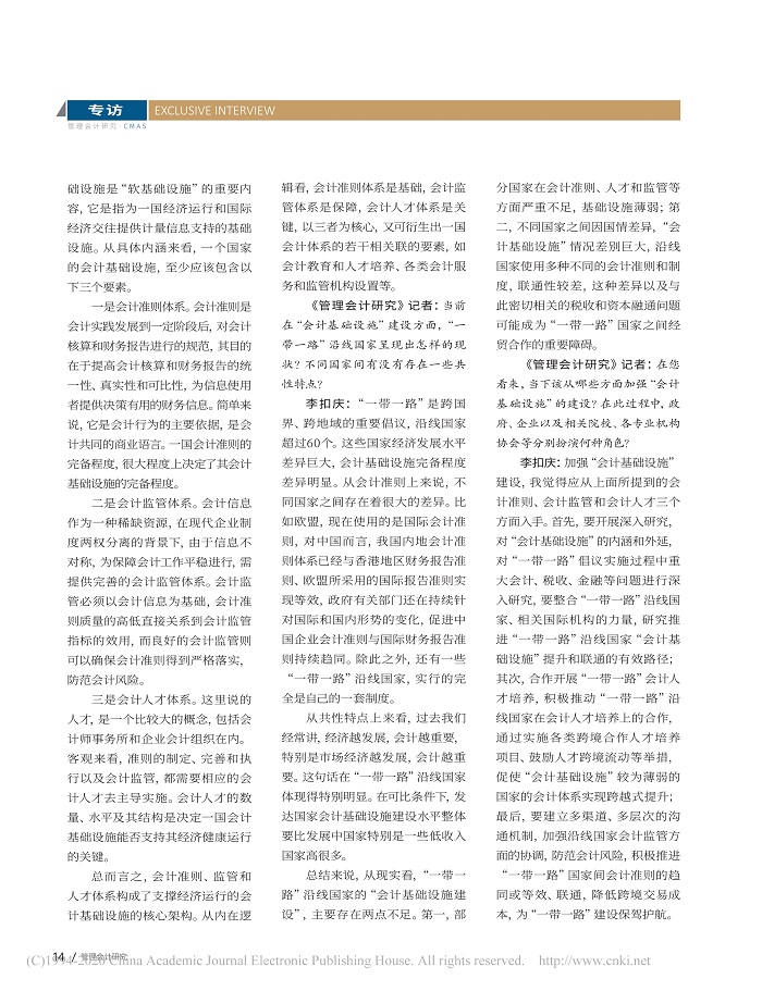 “一带一路”倡议下的会计基础设施构建——访上海国家会计学院党委书记、院长 李扣庆【2018年第1期,管理会计研究】