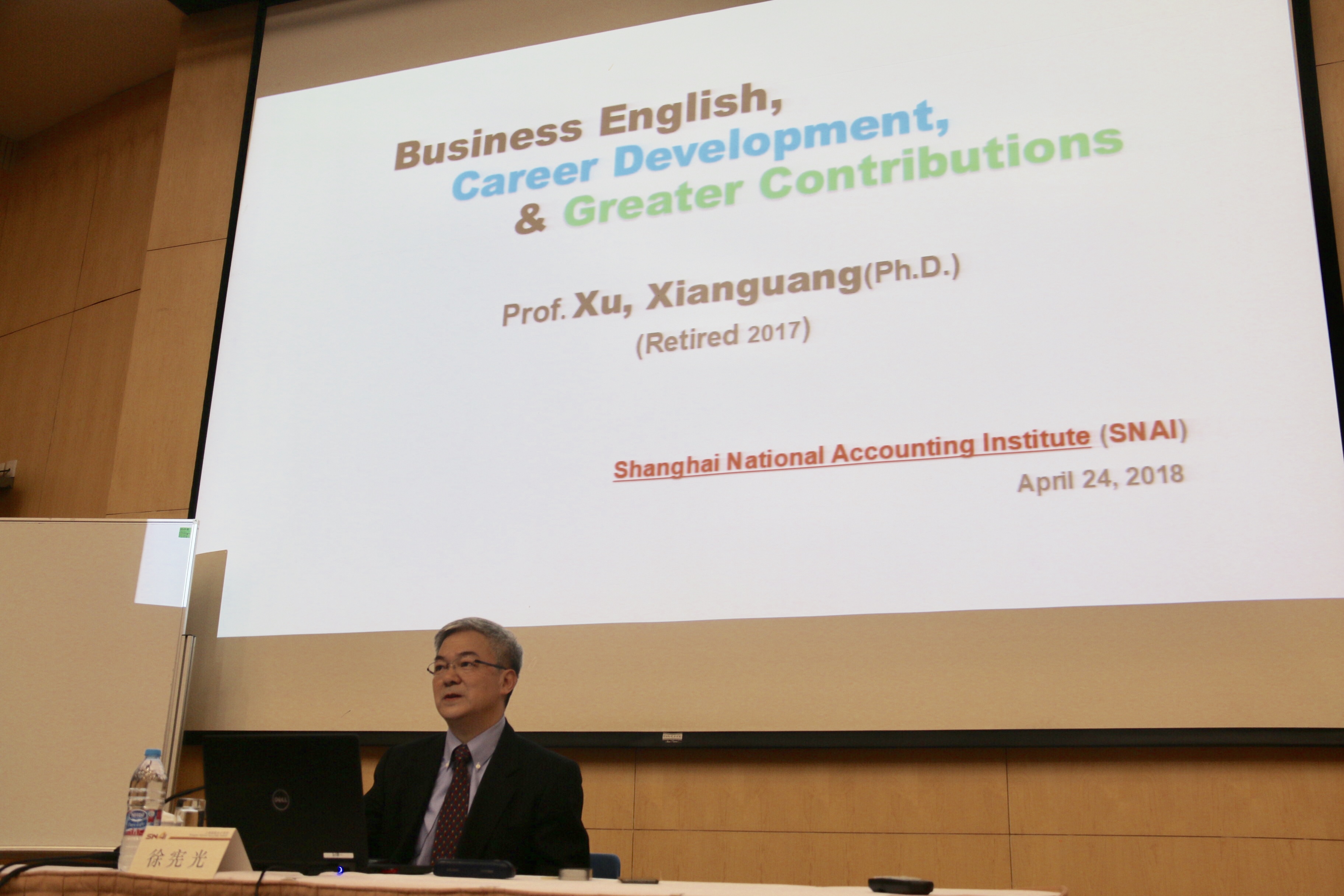 (撰稿:王金霞/摄影:钟雪冰)4月24日晚上,在学院200人报告厅,我们聆听了一场特别的思政讲座,主题是“Business English, Career Development, & More Contributions”(商务英语、职业发展、更多贡献),主讲嘉宾是上海国家会计学院徐宪光教授。研究生党总支开展的“SNAI青年大讲堂”去年至今已经举办了十二期,这次尝试的全英语专题式的思政讲座还是第一次。徐教授的激情和生动的演讲带动着每一个同学,每个同学都打起一百分的精神来和徐教授进行互动,通过课堂效果和讲座结束后同学们的反馈,证明这次全新的尝试是成功的,这样的思政讲座形式也很受同学们的追捧。