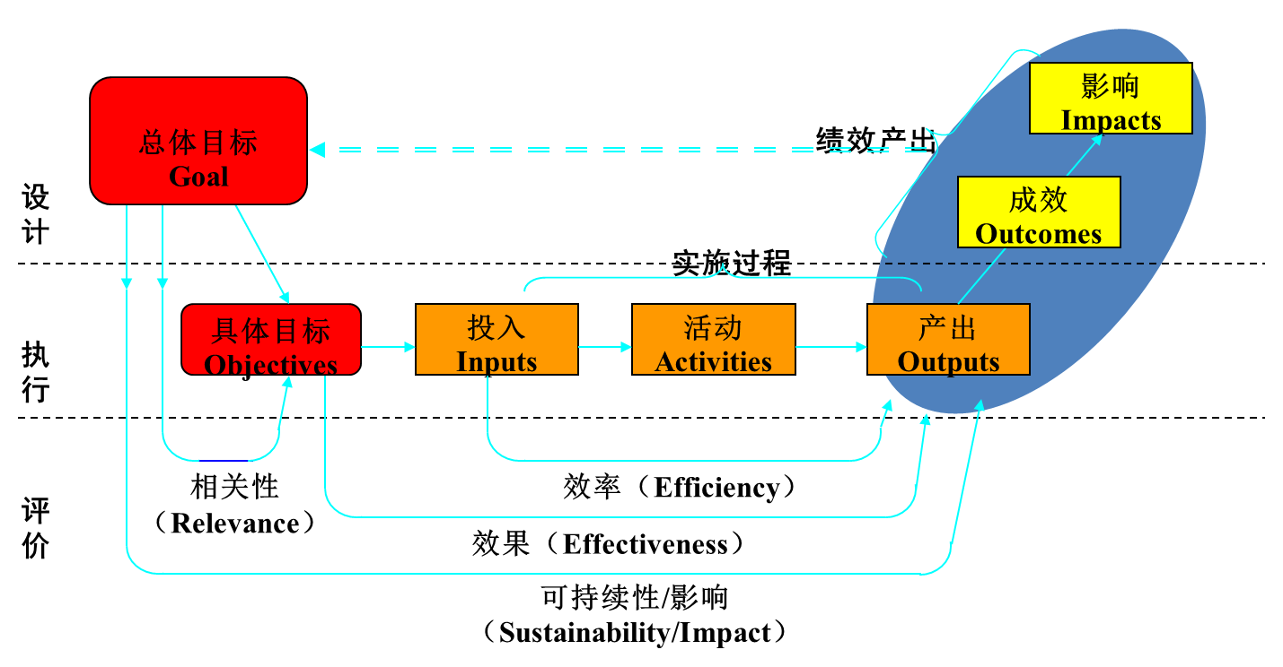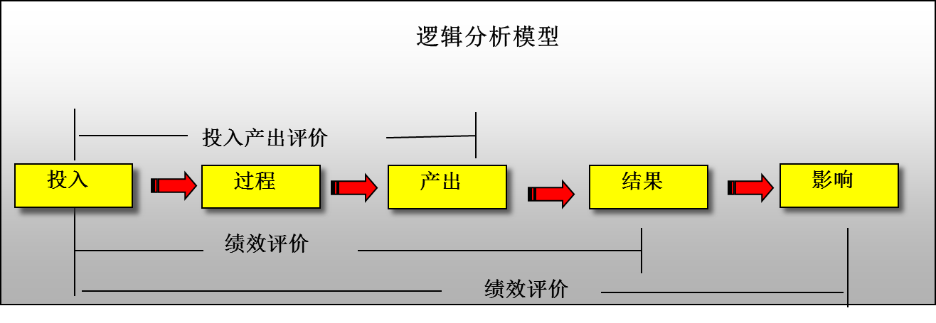 如下图所示,评价的逻辑分析模型将事物运动分为投入、过程、产出、结果和影响等五阶段,主要用来反映计划与预期效果之间的关系,其中涉及两个核心问题:这个项目会成功吗?项目风险在哪里?