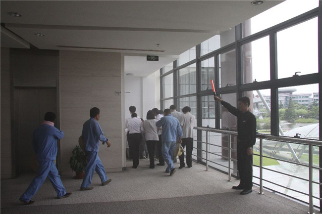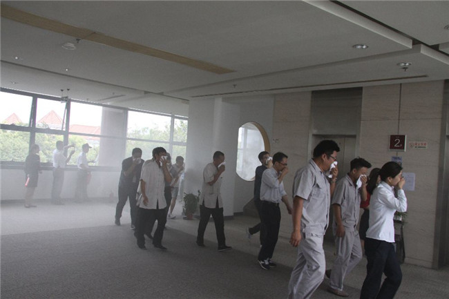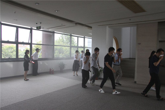 下午13点10分,疏散演练正式开始。在阵阵急促的报警声中,伴随着大量烟雾的侵入,马三教室及附近公共区域待命员工,手拿毛巾捂住口鼻,在安保及会务人员的指引下,快速有序地通过安全通道撤离到一楼大厅。整个疏散过程持续2分钟左右,期间未出现人员摔倒或碰伤现象,达到预期效果。