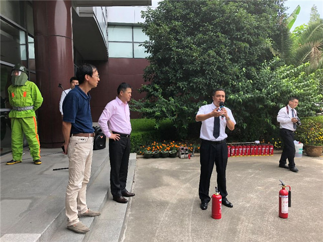此次活动分消防安全教育与实战演练两个环节进行。在消防安全教育开始之前,后勤部蔡志伟主任首先传达了市消防委为确保年底中国国际进口商品博览会顺利召开,下发的重点单位“零火灾”创建工作实施方案具体内容,以及围绕方案提出的“6+1”要求所采取的具体措施。并指出,此次活动也是学院平安单位创建工作的一部分,各部门及驻院物业要积极参与,协同配合,通过演练进一步提高大家对火灾等突发事件的应变处置能力。随后,东湖物业安保部经理周蕾结合我院安保设施配置情况,向大家详细讲解了火灾的报警、逃生及灭火自救等相关消防知识。