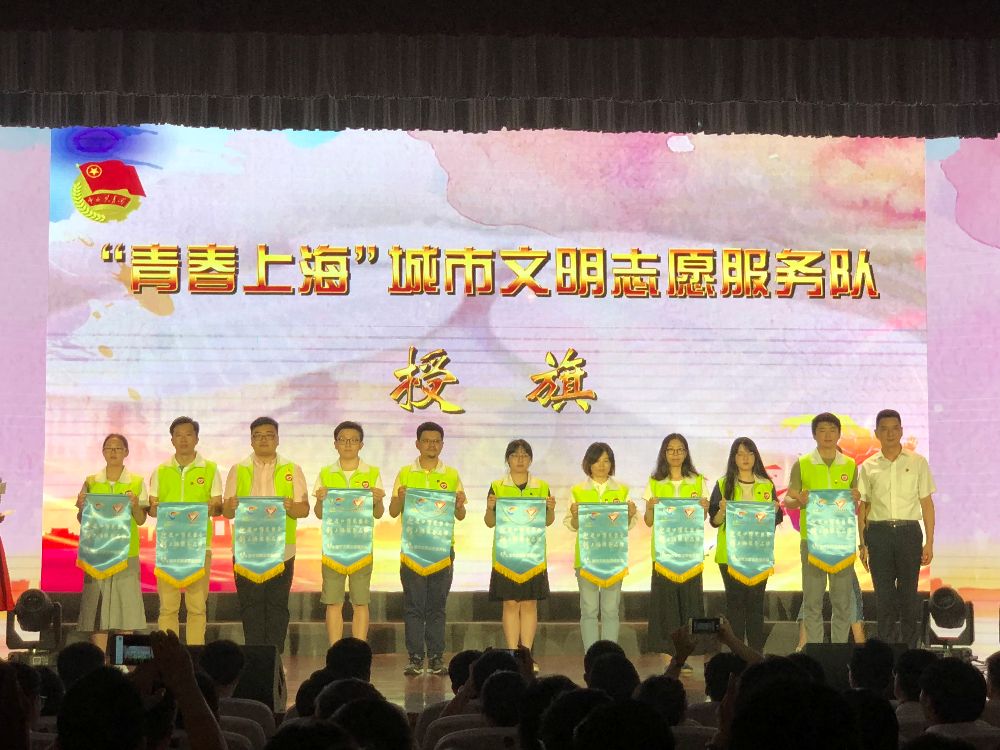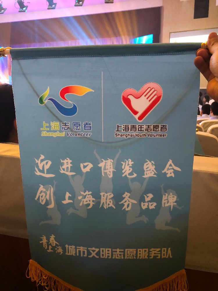 我院志愿者服务队队长胡晓栋作为“青春上海”城市文明志愿服务队代表上台,接受志愿服务队创建锦旗,“迎进口博览会、创上海服务品牌”。