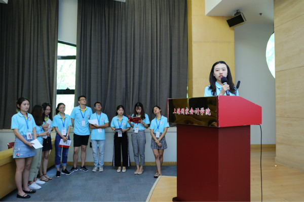 考评过后,结业典礼正式拉开帷幕。在奏唱完《中华人民共和国国歌》后,全体落座。灯光转暗,大屏幕上开始播放由暑期学校研究生自发制作的回顾短片。短片的剪辑和制作十分精美,构思巧妙,内容丰富又不失灵动与活泼,画面表演极具张力。短片主要由素质拓展、小组展示、户外活动、学校介绍、上课百态等部分组成。各组成员都积极参与了短片的制作,每幅画面都充满了欢声笑语。两周的时光在五分钟内映射出自己最美的倒影。视频结束,台下掌声雷动,同学们在为自己鼓掌,也在为这两周时间内付出辛苦劳动的老师与工作人员鼓掌。灯光亮起,本次暑期学校的研究生代表高陈慧宁登台进行发言。高陈慧宁代表全体暑期学校研究生表达了对学位委员会、学院、老师们及工作人员甚至校园里一草一木的感恩与喜爱之情,并分享了在学院虽短犹长的精彩生活,用真挚的语言诠释了两周来的成长与收获,并表达了对上海这座城市的喜爱和对同学们未来的美好祝愿。静水流深,沧笙踏歌;二周朝夕相处,一朝各奔天涯。愿同窗们此去前程似锦,再逢依旧如故。