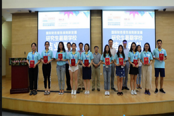 (撰稿/高婉莹;摄影/角度摄影)2018年7月27日上午, 2018年上海市“国际财务报告准则新发展”研究生暑期学校结业考评暨结业典礼于上海国家会计学院第三教学楼150人报告厅顺利举行。上海国家会计学院研究生部主任、暑期学校副校长郑德渊副教授出席典礼,上海国家会计学院郭永清教授、佟成生副教授、宋航副教授和叶小杰副教授受邀担任考评专家。典礼由研究生部刘荣光老师主持。主持人对考评专家及考评流程进行简要介绍后,各小组依次上台对自己团队的课题研究成果进行展示,各展风采。考评专家对论文进行问答评议,并提出进一步完善的意见。考评结束后,考评专家组进行评议并填写结业考评表决票。经过公平公正地计分后,主持人代考评专家组组长宣布考评决议,全体90名暑期学校研究生皆顺利通过结业考评。