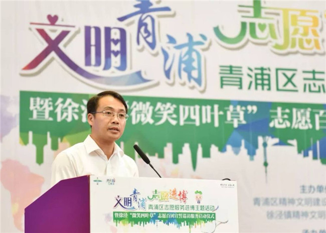 首先,启动仪式在区委宣传部副部长、文明办主任俞峰的致辞中拉开帷幕。他表示,青浦正在全力争创全国文明城区,我们将以此为契机,大力弘扬、全面实践志愿精神,让青浦志愿者成为服务进博盛会的一支重要的力量和闪亮的风景。徐泾的“微笑四叶草”是青浦的明星志愿品牌之一,我相信“微笑四叶草”志愿团队一定会与全区志愿者一道,以最佳服务,最美笑容,服务好家门口的这场盛会。