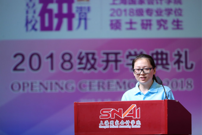 首先,三位学生代表上台发言。2018级全日制研究生鲁娅珺同学引用习近平主席的话:天道酬勤,幸福都是奋斗出来的。鲁娅珺同学代表新生表示,在未来两年,将学会独立地看待社会和思考世界,不断释放个人创造力,丢掉速成的幻想,坚持乐观、坚持正能量、坚持脚踏实地。随后,2018级非全日制研究生代表贺嘉同学激动地表达了对学院师长的感谢之情和成为一名SNAIer的喜悦之情,言语间满溢对学院的热爱与自豪。同时她代表非全日制新生表示,要牢记校训,以诚信为本,坚守原则底线,不做假账。在校生代表、2017级会计2班张宇欣同学向新生描绘出学院美好生活的图景,并基于自己一年来的成长与感悟分享给新生两个话题。一是要有高远的理想和家国情怀,心怀天下。二是要对其他学科保持好奇心,不同学科之间本质仍是相通的。她引用上届优秀学长常远的话鼓励大家:你是什么,SNAI便是什么。你发光发热,SNAI便不会黑暗。
