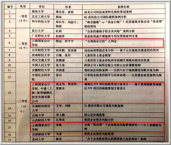 据悉,为进一步推动案例开发、研究及案例教学的开展,提高我国税务硕士(MT)专业学位的教育质量,由全国税务专业学位研究生教育指导委员教学案例中心主办,西南财经大学承办的第二届全国MT教学案例大赛及优秀教学案例评选活动于2017年9月启动,截止2018年3月31日,大赛共收到来自24家培养单位的44篇参评案例。这些案例主要适用于税务专业硕士的《税收理论与政策》、《中国税制》、《税收筹划》、《国际税收》、《税务管理与稽查》等课程。本次大赛评选出一等奖3名,二等奖6名、三等奖10名。我院共有3位教师参加此次活动并均获奖。