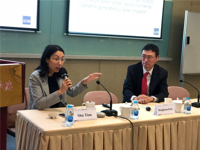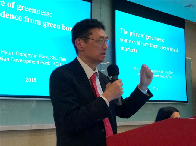 (撰稿/摄影:陈宝莲)10月8日下午,在区域项目一部的协调下,亚洲开发银行经济研究局的首席经济学家Donghyun Park博士和田澍博士给我院留学生带来一场关于“绿色如何定价:来自绿色债券市场的实证研究”的精彩讲座。橡睿投资合伙人和投资总监蒋舒博士作为特邀点评专家也分享了中国绿色债券市场发展的情况。2017和2018两级留学生共60人参加讲座。
