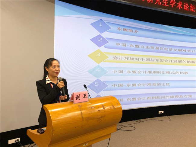 第一场活动由广西财经学院的刘卫教授以《中国-东盟会计比较》为题为大家进行了主题讲座。在“一带一路”倡议下,中国东盟合作日益密切,如何更好的推动中国-东盟经济一体化,会计是一个重要的因素,会计信息作为通用的商业语言对于资本的自由流动是一个极其重要的基础,中国东盟自由贸易区发展,尤其需要一个可比的会计信息。了解东盟各国的会计环境、会计模式和会计准则,是开展中国、东盟各国会计协调,寻求会计合作与发展模式的主要基础。刘卫教授分别从中国-东盟自由贸易区经济发展对会计的要求、会计环境对中国与东盟会计发展的影响、中国-东盟会计准则制定模式的比较、中国-东盟会计准则的比较以及中国-东盟会计准则趋同的障碍及对策等六个方面,深入解析了会计准则之间存在的差异,以及产生这些差异的深层次原因,并针对这些原因提出了促进我国会计准则国际协调的有效建议,从会计视角解读如何推进中国-东盟金融开发开放。
