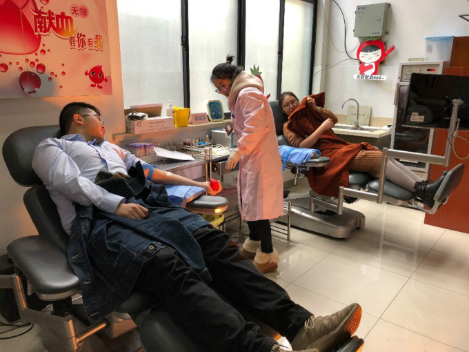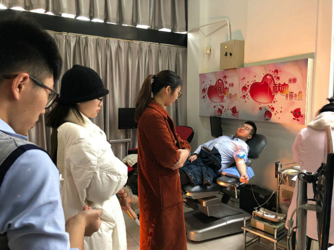 抵达上海市青浦区献血站后,同学们有序地从服务中心接过信息调查表,登记相关信息。填完表后,就是血压、血型的测量了。检测完成,需要等待一段时间才能开始献血,大家既紧张又兴奋,纷纷开始谈论起自己的献血经历。