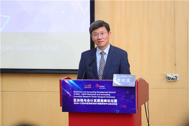 院党委书记、院长李扣庆教授出席并致辞,他首先感谢与会专家对本次高峰论坛的大力支持,他指出当今社会已经发生彻底变革,技术扩散的速度已显著快于人们的认知水平,技术由此带来的影响和鸿沟将不断扩大,未来财务领导人、企业领导人以及社会的领导人都将以数字化转型为工作重点。近年来上海国家会计学院一直在努力帮助财务领导人掌握财务方面的知识、技术、工具,帮助大家更好地适应这个时代。区块链与会计创新研究中心的成立代表了上海国家会计学院进一步的承诺和决策。同时,他还借助论坛向行业里杰出的专家们发出邀请,一起推进现代信息技术和会计审计发展之间的联系,帮助未来的财经领导人更好地应对未来的挑战。