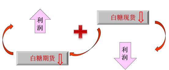 2007年1月,中粮屯河董事会审议通过《关于公司开展食糖期货业务议案》。据中粮屯河2007年年报披露,其用于反应期货持仓浮动盈利的“其他流动资产”账户上有1697万元浮盈。2008年年底“其他流动资产”仅196万元,但落袋为安的“套期工具价值变动”显示“本期增加”了1995万元。2009年糖价走出低谷并开始新一轮上涨,2009年年底中粮屯河出现8471万元的期货浮动亏损。2010年截至6月底,其期货浮动盈利仍有8366万元,但截至9月底,其转盈为亏的浮动亏损则已达到1.06亿元,也即其第三季度曾出现了近两亿元的浮动。在预测白糖现货价格下跌的情况下,公司的具体做法应该如下图所示: