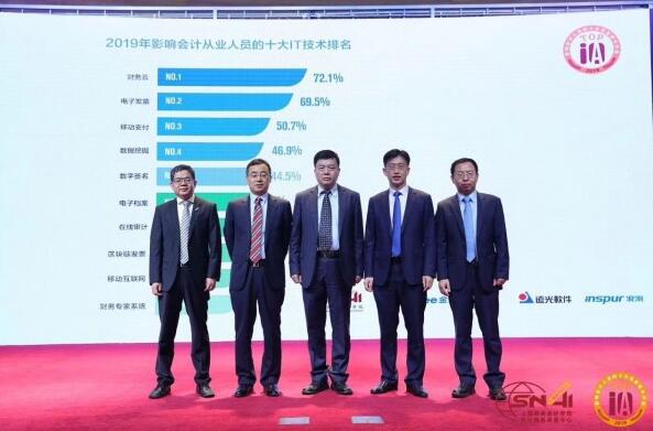 上海国家会计学院党委副书记、副院长、中国会计学会会计信息化专业委员会主任委员、本次评选专家委员会主任刘勤教授、金蝶软件(中国)有限公司副总裁赵燕锡、北京元年科技股份有限公司总裁韩向东、远光软件股份有限公司高级副总裁李美平、浪潮集团副总裁魏代森共同公布了评选结果。2019年影响中国会计从业人员的十大信息技术依次是:财务云、电子发/票、移动支付、数据挖掘、数字签名、电子档案、在线审计、区块链发/票、移动互联网以及财务专家系统。