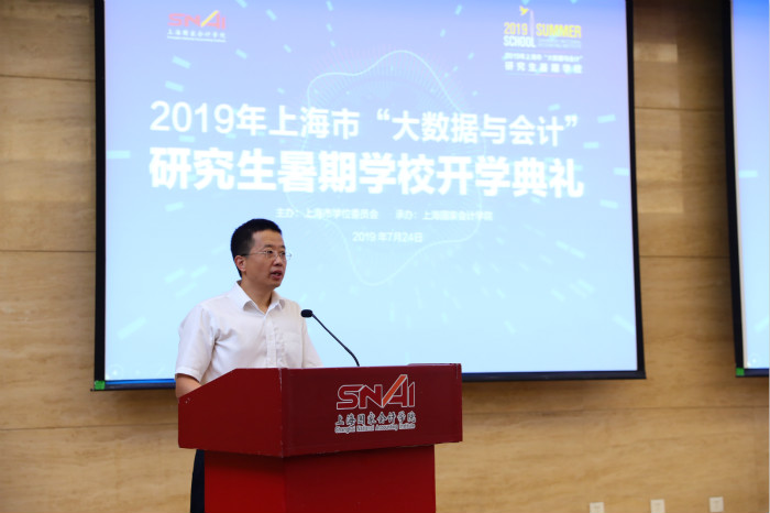 上海市学位办束金龙主任发表重要致辞。束主任首先代表上海市学位委员会对2019年“大数据与会计”研究生暑期学校的开学表示热烈祝贺,感谢上海国家会计学院承办暑期学校,也非常欢迎来自不同的学校研究生们到上海国家会计学院参加暑期学校。随后,束主任重点介绍了举办暑期学校的背景和意义。他指出,教育部公布的《学位与研究生教育发展“十三五”规划》中指出:中国2020年在学研究生总规模将达到290万人。2019年全国在读研究生260万,再经过一年努力,基本可实现目标。这个数字与世界发达国家相比,绝对数位居第二位,但相对数较低,美国每千人达到9位在读研究生,但我们要达到每千人达到9位,至少要翻四倍。我国1978年恢复研究生教育到现在,用四十年时间培养了一千万研究生,未来十年目标是再培养一千万,增速快压力大。不仅上述两项挑战,在目前经济形势下,还面临很多挑战,为了实现在2020年要率先总体实现教育现代化的目标,上海从2006年开始,开设了各类暑期学校,到现在已经坚持了13年。每年依托上海国家会计学院等院校面向全国研究生开展三十多场暑期学校,教委给予专项经费支持,以期利用优质的师资平台为研究生打造学习、交流的平台,让研究生在不同校园间相互学习相互交流,提升自身实力。