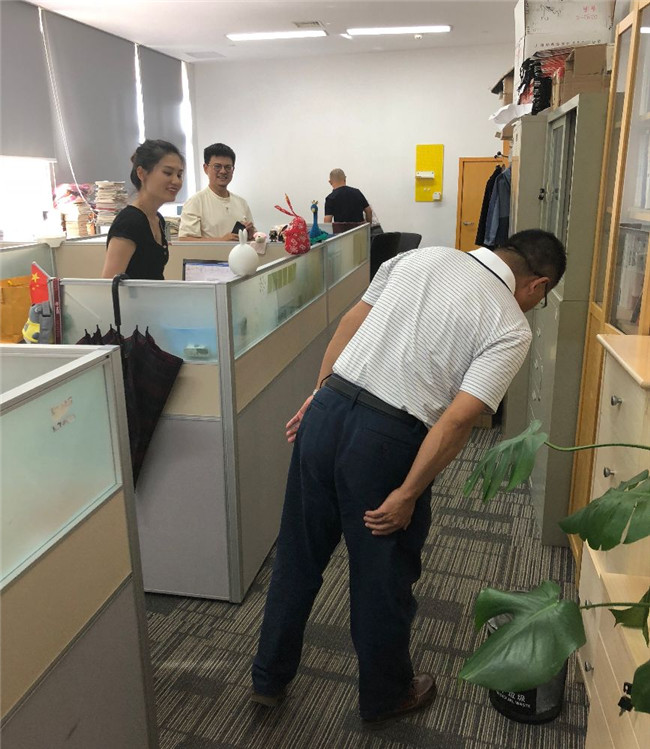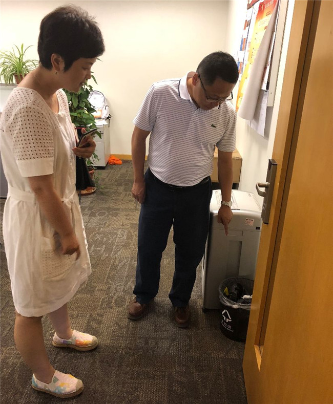 检查到行政楼时,易助理走进办公室仔细检查每个垃圾桶分类情况,发现办公室垃圾分类情况良好,没有垃圾混投现象。易助理仔细询问了大家在垃圾分类过程中遇到的问题,并建议如果在分类中有疑问可以通过上海发布官方推荐的垃圾分类查询小软件查询。