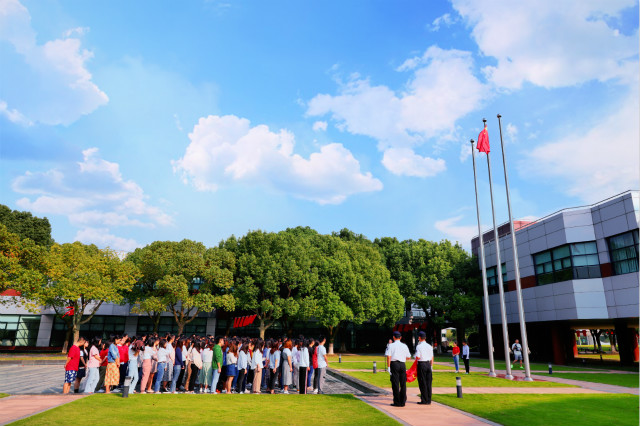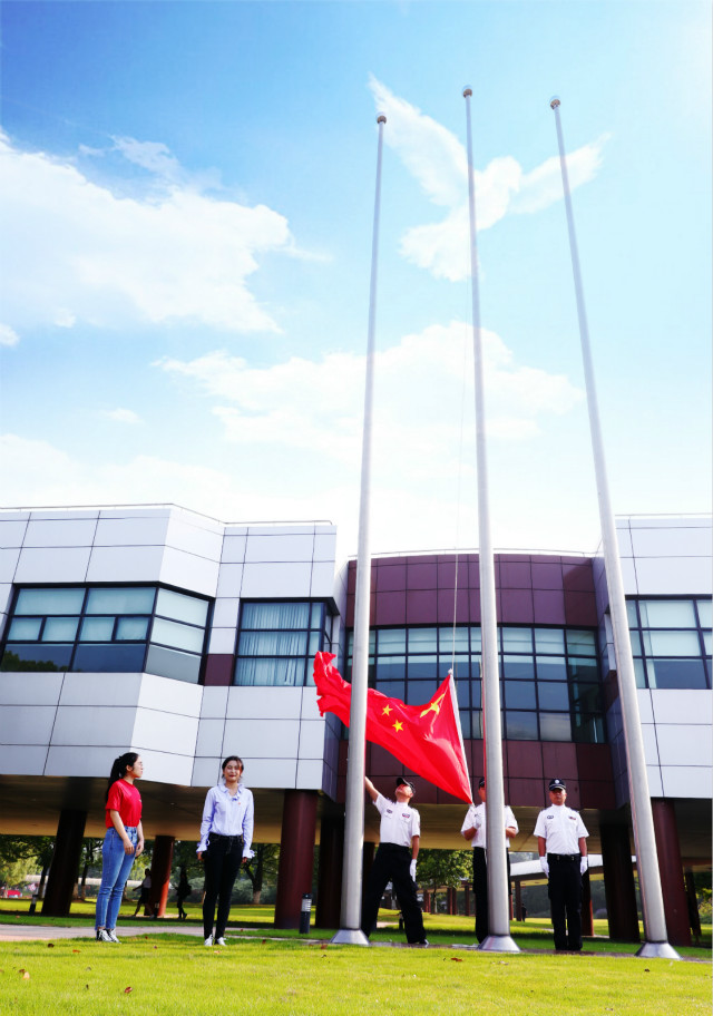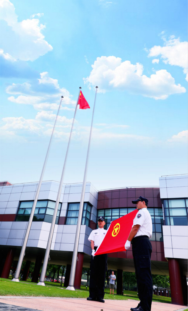 上午8时,升旗仪式准时在上海国家会计学院第一教学楼前举行。伴随着庄严的国歌,五星红旗冉冉升起,迎风飘扬。在场的每一个人向国旗行注目礼,齐唱国歌,国旗在微风骄阳中徐徐升起。