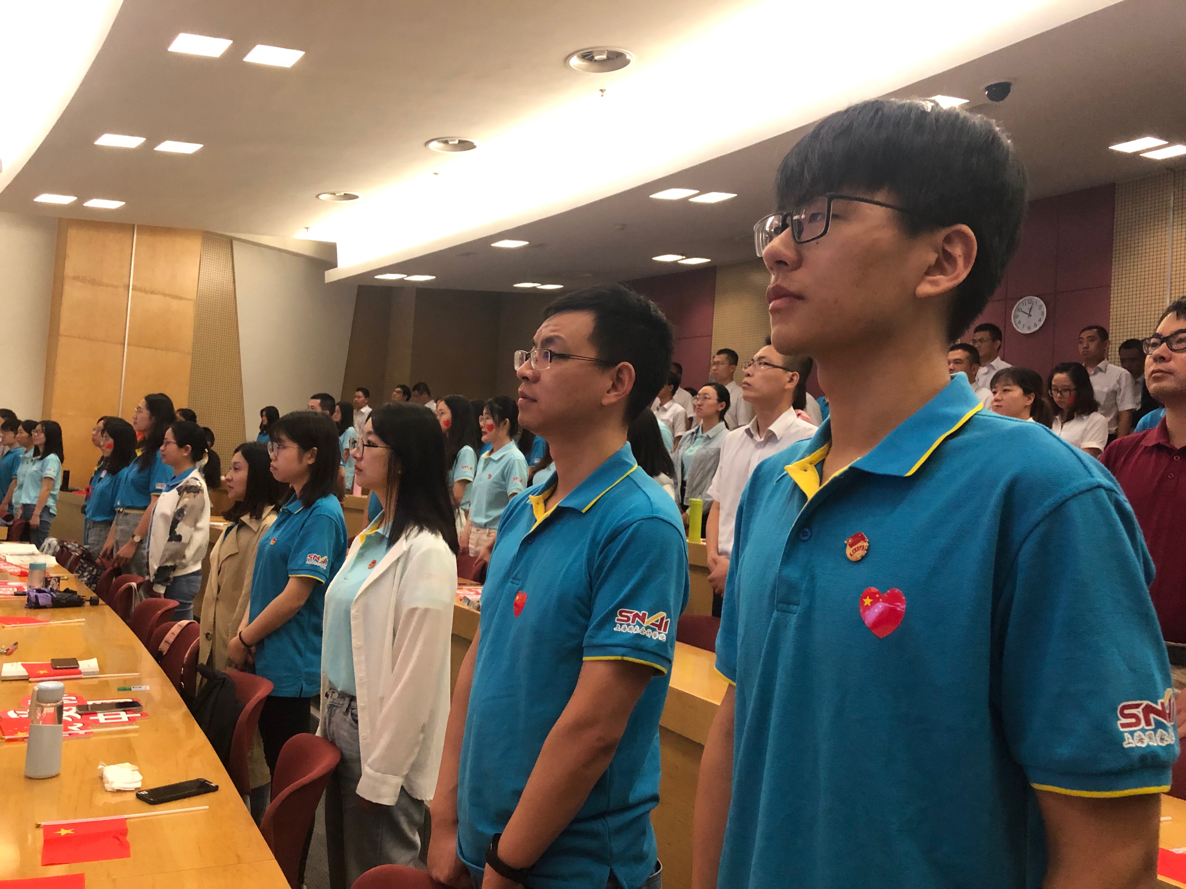 时间是伟大的书写者,记录走过的足迹。这是中国特色社会主义进入新时代的首次国庆阅兵式,也是很多同学第一次在校集体庆祝国庆。上午九时许,当李克强总理发出“全体起立”的口令时,报告厅内的所有人都自发站立起来,对护旗队行注目礼,随后国歌奏响,全体师生齐唱出国歌,抒发自己的爱国之情和民族自豪感。