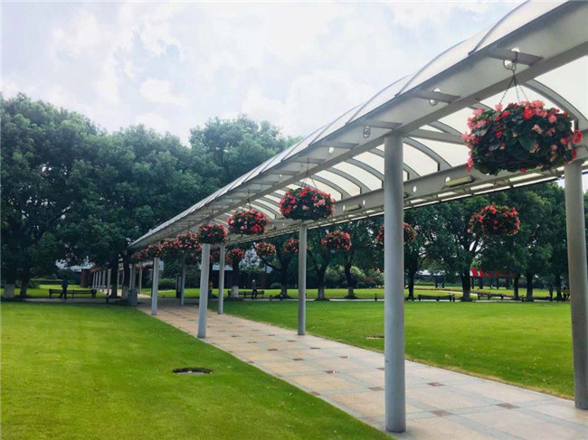 为延续绿化景观的一致性,连接学院的多处桥梁、连廊及众多灯柱以学院苗圃自己培育的海棠和番薯进行立体景观装饰,在行进中感受校园郁郁葱葱的美好景象,体会祖国繁荣昌盛的强烈自豪。