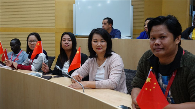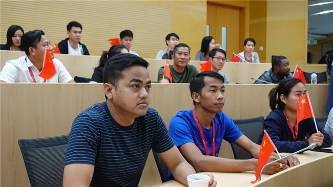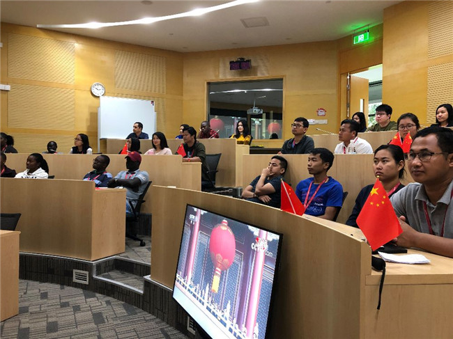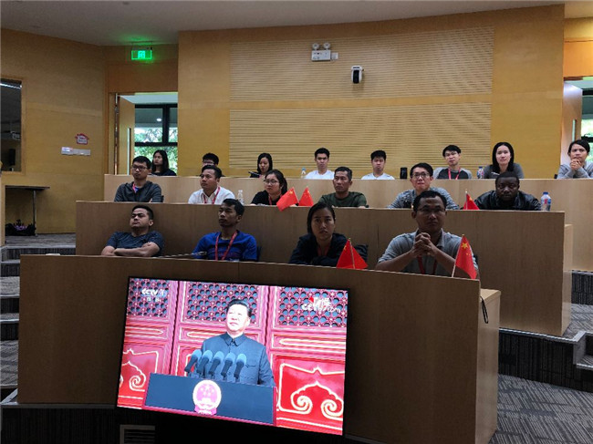 10月1日上午9点,来自柬埔寨、老挝、缅甸、尼泊尔、坦桑尼亚、格林纳达、南苏丹、纳米比亚、加纳、塞拉利昂、厄立特里亚、埃塞俄比亚、利比里亚等13个国家的40多名留学生齐聚一堂,怀着激动的心情观看庆祝中华人民共和国成立70周年阅兵仪式。留学生们挥舞着中华人民共和国国旗,一边观看电视直播等待阅兵仪式开始,一边交换着彼此激动的心情。