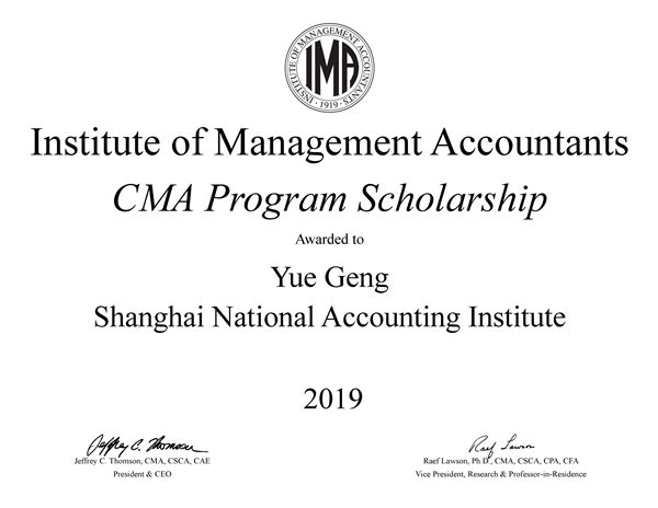 能够被推荐参加CMA奖学金评选的学生必须成绩优秀,具备领导潜能,并有志于投身管理会计行业,学院获奖的研究生正是其中的典型代表。CMA奖学金免去获奖同学三年内参加CMA两门考试(首次)的全部相关费用。今年获奖的五名研究生将获得IMA提供的首次注册费、三年年费、CMA考试准入费、两门考试费等总价值849美元的全部费用豁免。除上述奖励之外,IMA 还将向获得 CMA 奖学金的学生颁发获奖证书。