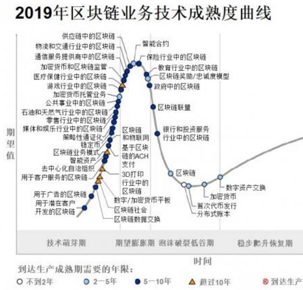 吴忠生老师以高德纳(Gardner)新兴技术成熟度曲线来引入区块链技术。高德纳新兴技术成熟度曲线显示了一个新兴的技术从形成开始,将会经过技术萌芽期、期望膨胀期、泡沫破裂低谷期和稳步爬升期这四个阶段的规律。从这张图中可以看出,区块链技术从形成开始,很快到达期望膨胀期,后又进入泡沫破裂期,现在区块链技术和其中最为成熟的加密数字货币技术已经慢慢走出低谷开始向稳步爬升期发展。