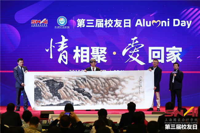 在校友捐赠环节,EMPAcc项目黄埔一期向学院教育发展基金会捐赠41万元;EMBA五期班收集了2000年到2018年的大版龙票赠予学院;EMBA服务一期班陈瑾芳赠予学院一副个人作品——《紫气东来》;山西农信社文化部副部长多亚波校友代表山西省农信社向学院捐赠一副气势磅礴的书画家作品——《天上来 奔海里》。