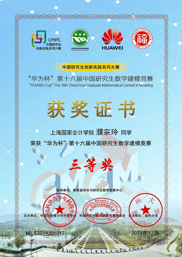 (撰稿/摄影:刘荣光,郑思敏)2019年12月1日, “华为杯”第十六届中国研究生数学建模竞赛颁奖大会在福州大学举行。我院共有7名全日制研究生荣获三等奖,9名全日制研究生获成功参与奖,获奖队伍数量和人数再创新高,创造了研究生参加该项比赛历史最佳成绩。