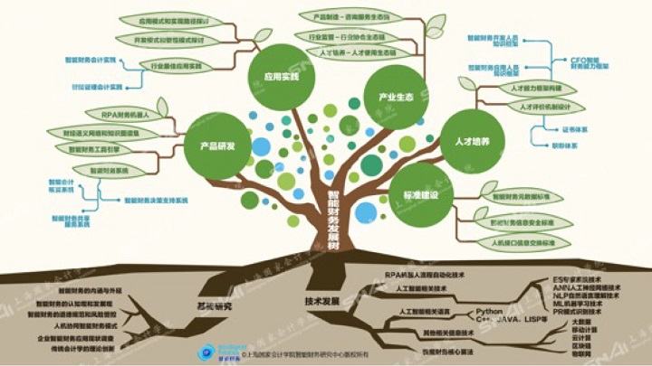 上海国家会计学院党委副书记、副院长刘勤教授介绍了智能财务研究中心的发展现状。他表示,经过一年的发展,一方面智能财务研究平台的规模不断扩大,陆续吸引了IMA(美国管理会计师协会)、专注RPA的艺赛旗公司、中兴新云、科大讯飞、用友网络等业界著名的协会和公司加入中心,成为新的合作伙伴;另一方面,中心初步组建了由60余名院内外专家组成的兼职研究人员队伍,发布了15个重点研究课题,内容涉及核心技术、应用场景、转型机制、风险管控、能力框架、人才培养等方面,得到了中心研究人员的积极响应。其中11个课题顺利立项并完成研究。刘勤教授借助一棵智能财务发展树描绘了智能财务研究中心未来的研究蓝图,树根是基础研究和技术发展,树干包括产品研发、应用实践、产业生态、人才培养和标准建设。