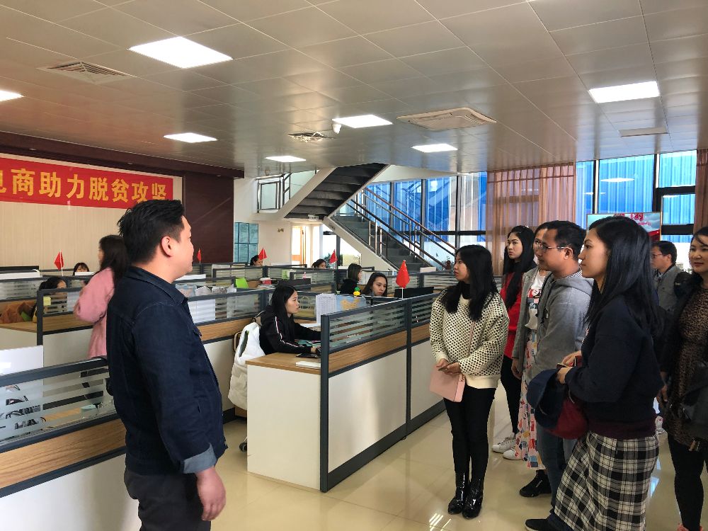 12月5日下午,留学生们首先来到了“巧妇九妹”电子商务基地。三年前,甘有琴只是灵山县一名地地道道的普通农妇,而如今以她本人为主人公的“巧妇九妹”账号已经成为三农短视频领域数一数二的大号。从17年开始,得益于众多粉丝的信任,九妹渐渐在平台上开始销售家乡的特产,做起电商。迄今,拥有线上一千多万粉丝的“巧妇九妹”品牌已经成为灵山县最大的电商品牌,甘有琴以“农户+基地+合作社+公司”的发展模式,带领着全村人民脱贫致富。