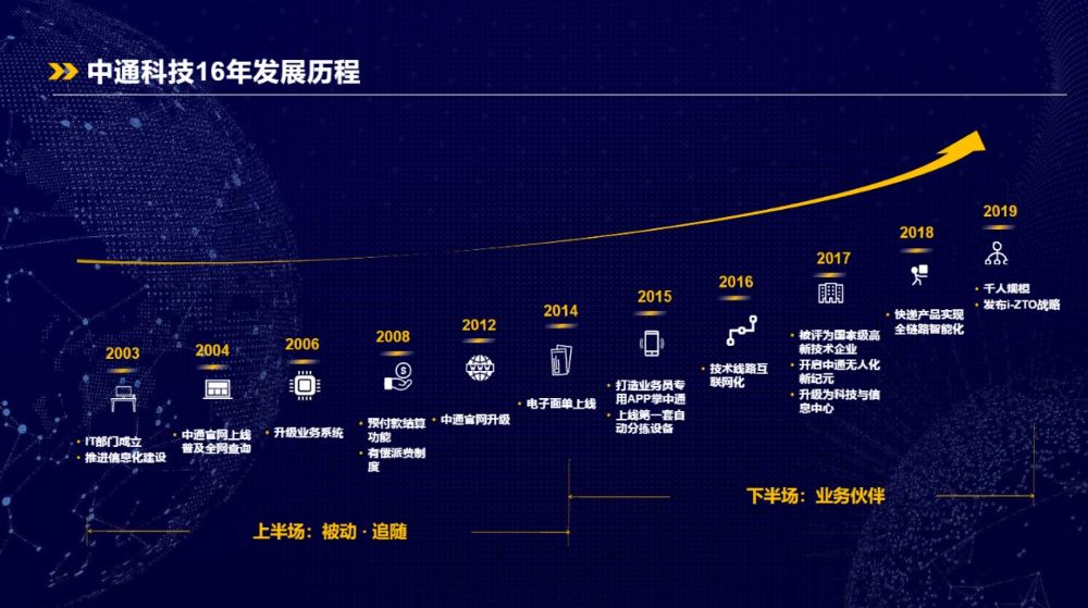 2016年10月27日,中通在美国纽交所上市,成立于2002年从桐庐小镇走出来的中通快递,成为了全球业务量最大的快递公司,中通已经成为国际一流的综合型快递物流服务商。中通快递也从传统的肩扛手提,到后来的机械化、自动化,到现在的数字化、智能化发展阶段。