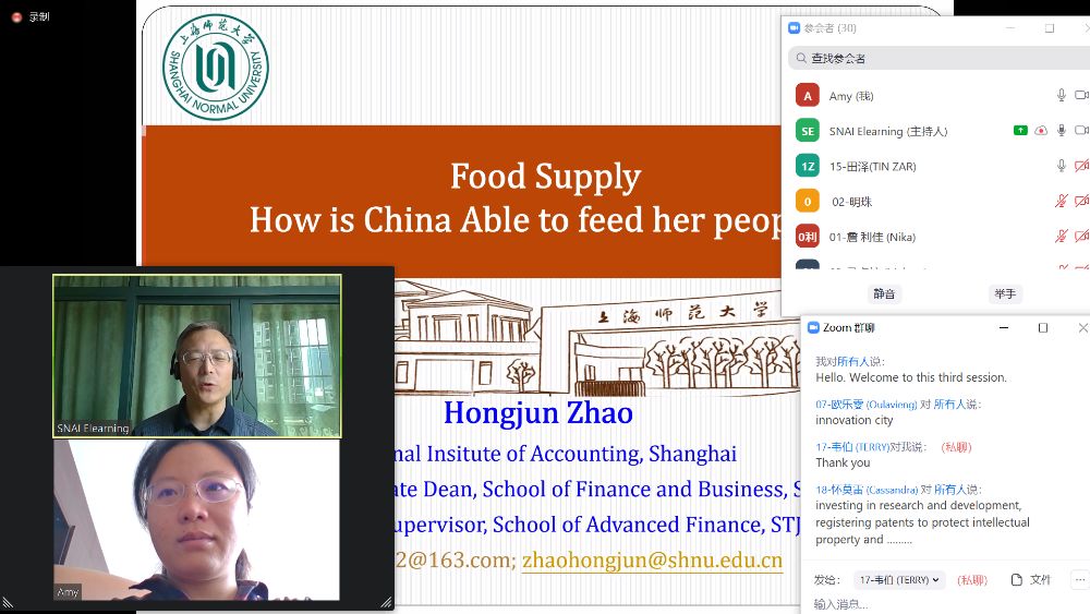 在本学期的线上课程部分,为进一步帮助留学生读懂中国,深化对中国的认知,赵教授主要选取了中国的“一带一路”倡议、创新推动城市发展、中国的粮食供给等重点内容进行讲授。在授课过程中,赵教授善于从与生活息息相关的现实案例入手,辅以直观生动的图片和鲜活的短视频素材,向留学生展示中国在解决自身发展问题时凝聚的中国智慧与中国方案,在开诚布公的对话讨论而不是空洞的介绍与说教中启迪留学生思考。
