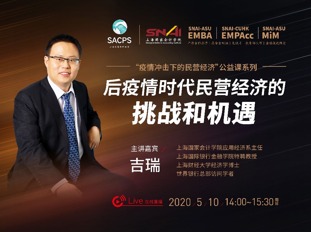 新冠疫情带来的经济大停摆给民营经济带来了严峻考验。为帮助全市民营企业和私营业主们提升视野、拓宽思维,提高疫情防控常态化下的经营管理能力,助力企业复工复产,上海国家会计学院与上海民营经济协会联合策划了“疫情冲击下的民营经济”系列公益讲堂活动。5月10日下午两点,公益讲堂第一期“后疫情时代民营经济的挑战和机遇”在线上拉开帷幕。上海国家会计学院副教授吉瑞为主讲嘉宾,上海民营经济协会会长陈士豪、上海国家会计学院合作项目部副主任田蓓共同参与本次直播。在田主任主持下,直播讲堂获得圆满成功,全程收看人次达1120人。