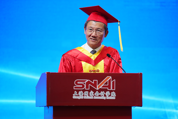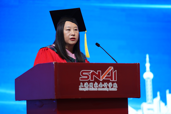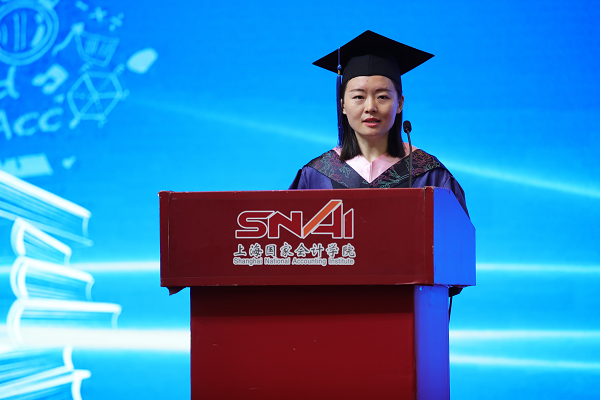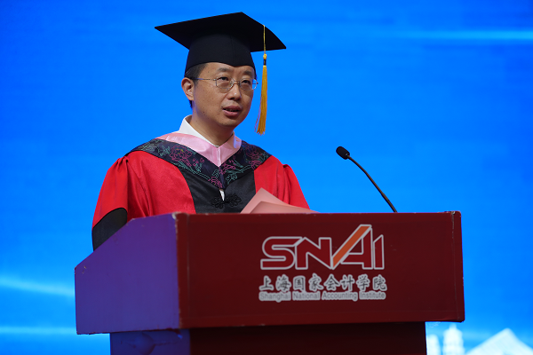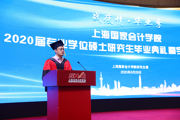 李扣庆院长在典礼上发表了重要致辞。李院长代表学院对134名顺利毕业的同学们表示衷心的祝贺,对研究生培养给予最大支持的校友、老师、家人们给予感谢。李院长表示,今年的毕业典礼是在一个特殊年代举行的一场特殊的毕业典礼,在全球都在竭力应对疫情的时候,我们需要思考一下疫情会带给我们怎样的思考和感悟。李院长与大家分享了自己对此次疫情应对的六点感悟,一是生命特别可贵,困难总是暂时的,永远要珍惜自己和他人的生命;二是担当特别可敬,在疫情中勇敢担当社会大义的人是最可爱的人,广泛参与其中的年轻人让人们看到了对中国未来的希望;三是待在中国、作为一个中国人很幸福,因为我们拥有一个关心人民生命安全的党和政府;四是人类必须敬畏自然,要尊重自然规律,加快推进科学进步;五是团结就是力量,疫情告诉我们人类是一个命运共同体,合则两利,斗则俱损;六是社会发展充满了不确定,能够拥抱不确定性的哪一面,取决于我们有怎么样的思维模式,做了怎样的心态和能力上的准备。李院长告诫大家要把毕业作为一个新的学习征程的起点,要持续强化自身能力建设,要牢记并践行“不做假账”的校训。李院长向大家承诺,在长三角的中心,在美丽的蟠龙路200号将会一直有精彩的课堂、温暖的问候、热情的拥抱在等候大家。最后,李院长勉励大家“博学明德,拥抱未来”。