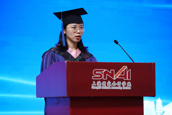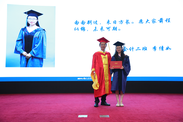 典礼上,李院长为毕业生授予学位并合影留念,刘勤副院长向毕业生代表赠送了建院20周年校友卡,卢文彬副院长接受毕业生赠送的纪念礼物,院长助理易宏勋老师为国家奖学金、优秀毕业生、优秀硕士论文获得者颁发了荣誉证书。EMBA金融十二期校友代表张楠为“易爱蟠龙”专项科研奖学金获得者颁发了荣誉证书,并在发言中和毕业生们分享了“易爱蟠龙”专项科研奖学金的由来及自己的从业经历,希望大家能够永远把SNAI当成一个大家庭,时常回来看看。王娇娇与房芳分别代表非全日制、全日制毕业生发言。