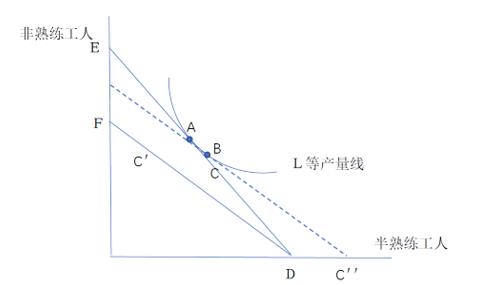 运用题目中的数据具体分析,假设总预算成本C=17*7.25+6*9.75=123.25+58.5=181.75,令C=9.75x+7.25y。分别相交于X轴于D点(C/9.75),Y轴于E点(C/7.25),此时企业的最优选择为A点,即雇佣6个半熟练工人和17个非熟练工人,以A点为切点作出相应的等产量线L。当最低工资上升时C'=9.75x+8.15y,分别相交于X轴于D点(C/9.75),Y轴于F点(C/8.15),将C'慢慢平移至等产量线相切的位置C'',与L相切于点B。此时企业会雇佣超过6个的半熟练工人,而小于17个的非熟练工人。(详见下图)