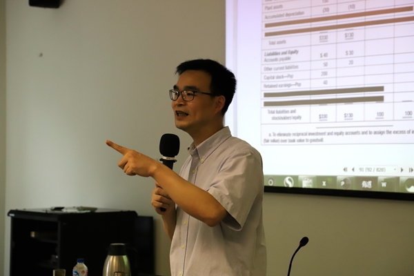 余老师使用全英文教材(Advanced Accountingby Beams)给我们授课,讲授的内容正是让无数会计学生头痛的长期股权投资与合并报表,这对于我们来说是一个双重挑战。我们开始特别忐忑,害怕上课困难重重,难以跟上老师的节奏,但是余老师用他专业的知识以及最真实的感受为我们一步步揭开财务会计神秘的面纱。