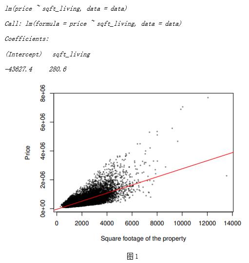 首先我们对数据进行了描述性分析,发现了房屋面积这个变量与房价有显著相关性,且大致呈现线性相关趋势(如图1),因此我们选取这个变量和房价建立线性回归模型,所用代码及运行结果如下: