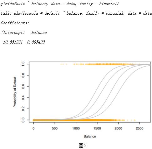 我们通过简要的分析发现一个人欠款概率与他的信用卡额度之间存在显著相关性(如图2),在此基础上我们进一步建模得到了这两个变量之间的逻辑回归模型,代码及运行结果如下: