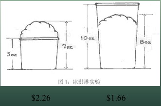如图所示,两款冰淇凌,一款冰淇凌堆得高高的,一款冰淇凌装不满杯子,堆得高高的那款冰淇凌价格稍高些,消费者也乐于为其买单。毕竟从视觉效果上来看,消费者下意识地会认为第一款冰淇凌份量更多,尽管事实上它的份量要少于价格偏低的那款。这就是视觉陷阱。