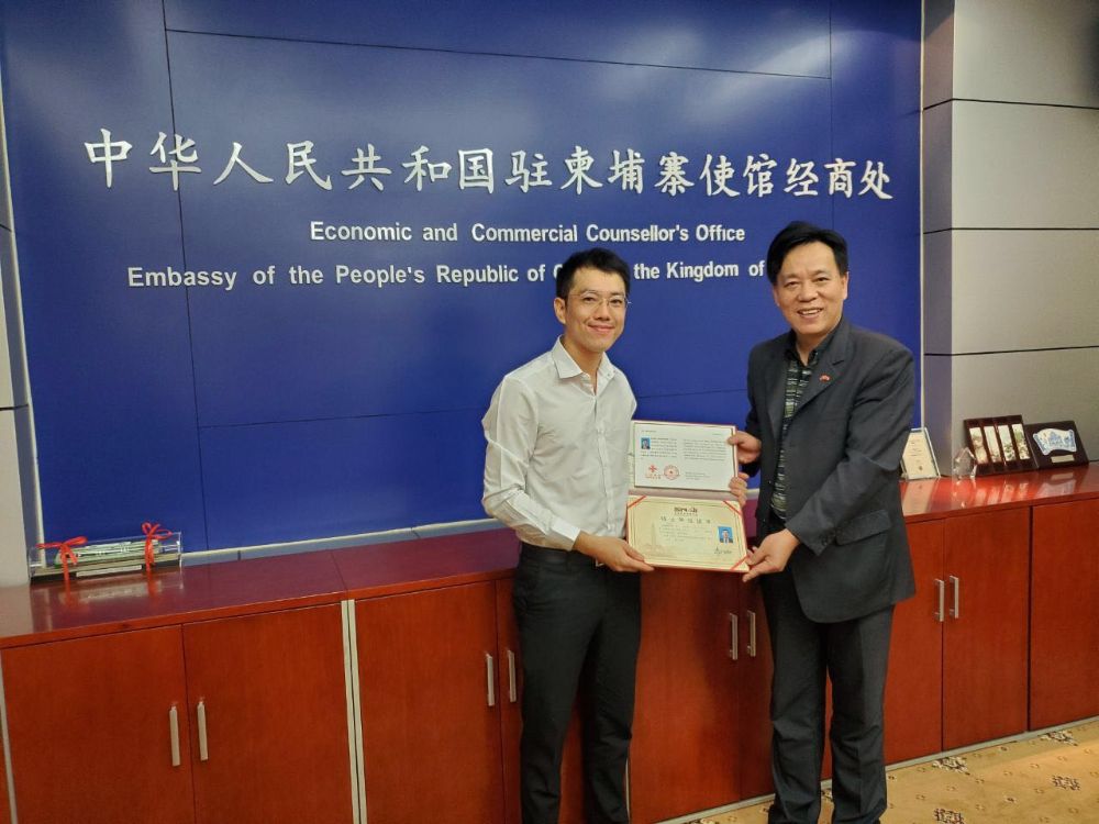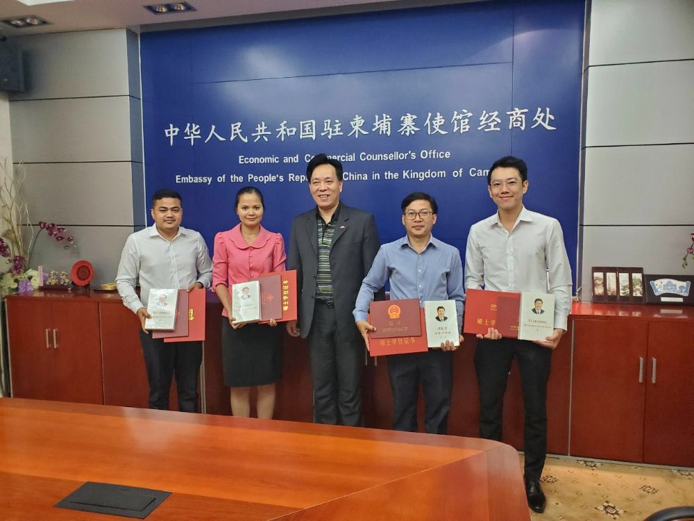近日,首批快递抵达了中国驻柬埔寨大使馆。部分在金边的柬埔寨留学生前往大使馆收取快递。使馆经商参赞邬国权代为向学生颁发了证书,并赠送了纪念品。拿到了期盼已久的证书,留学生们的心情都非常激动,并对商务部培训中心以及学院在证书及档案等材料寄送中所做的大量协调工作表示了衷心的感谢。