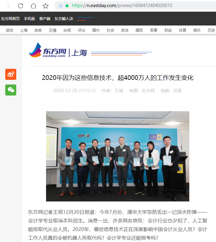 12月20日下午,一场聚焦影响中国会计从业人员的十大信息技术的专题研讨会在上海举行,上海国家会计学院与澳洲会计师公会(CPA Australia)邀请了相关行业专家与知名高校学者分享了自己的见解。会上还发布了《2020年影响中国会计从业人员的十大信息技术:现状与趋势》一书,分析解读了正在影响和将要对行业扇动“蝴蝶翅膀”的信息技术,“为中国会计从业人员观察信息技术的衍变,提供参考,创造更多价值”。