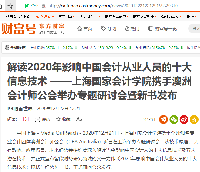 解读2020年影响中国会计从业人员的十大信息技术 ——上海国家会计学院携手澳洲会计师公会举办专题研讨会暨新书发布【2020年12月22日,东方财富网】