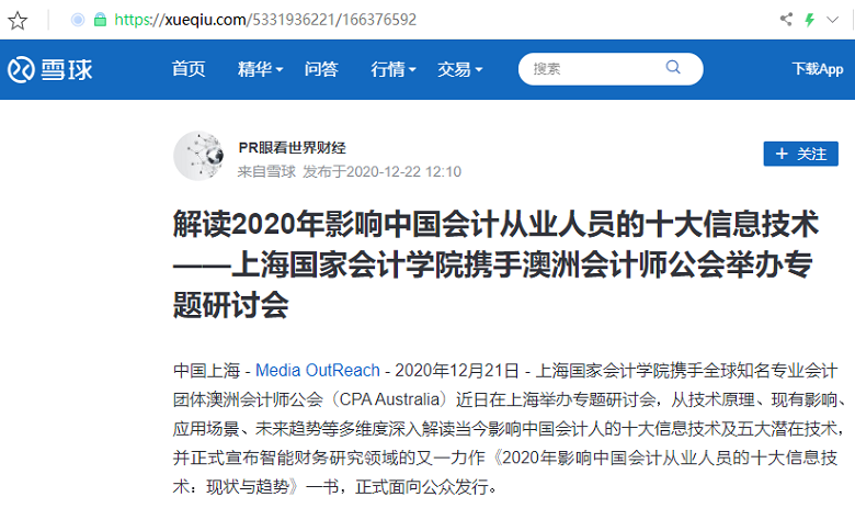 解读2020年影响中国会计从业人员的十大信息技术 ——上海国家会计学院携手澳洲会计师公会举办专题研讨会【2020年12月22日,雪球】