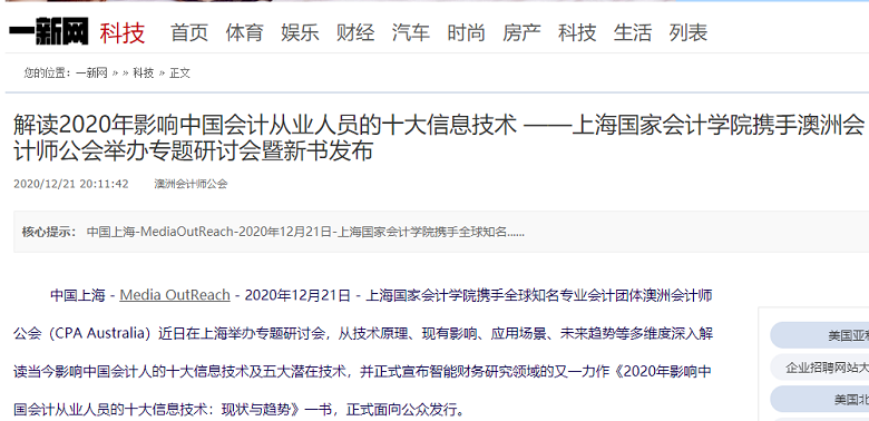 解读2020年影响中国会计从业人员的十大信息技术 ——上海国家会计学院携手澳洲会计师公会举办专题研讨会暨新书发布【2020年12月21日,一新网】