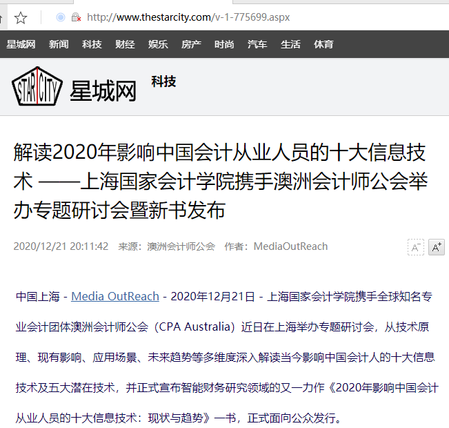 解读2020年影响中国会计从业人员的十大信息技术 ——上海国家会计学院携手澳洲会计师公会举办专题研讨会暨新书发布【2020年12月21日,星城网】