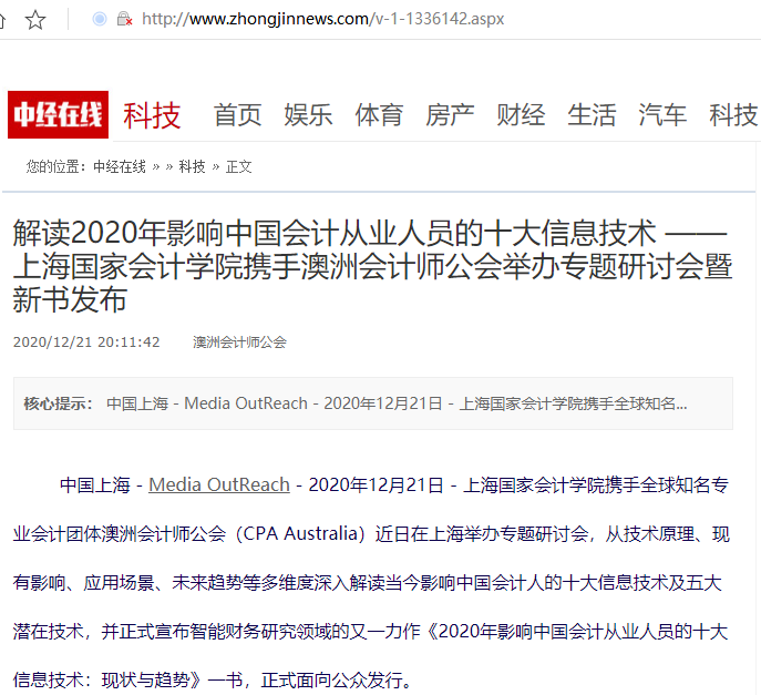 解读2020年影响中国会计从业人员的十大信息技术 ——上海国家会计学院携手澳洲会计师公会举办专题研讨会暨新书发布【2020年12月21日,中经在线】